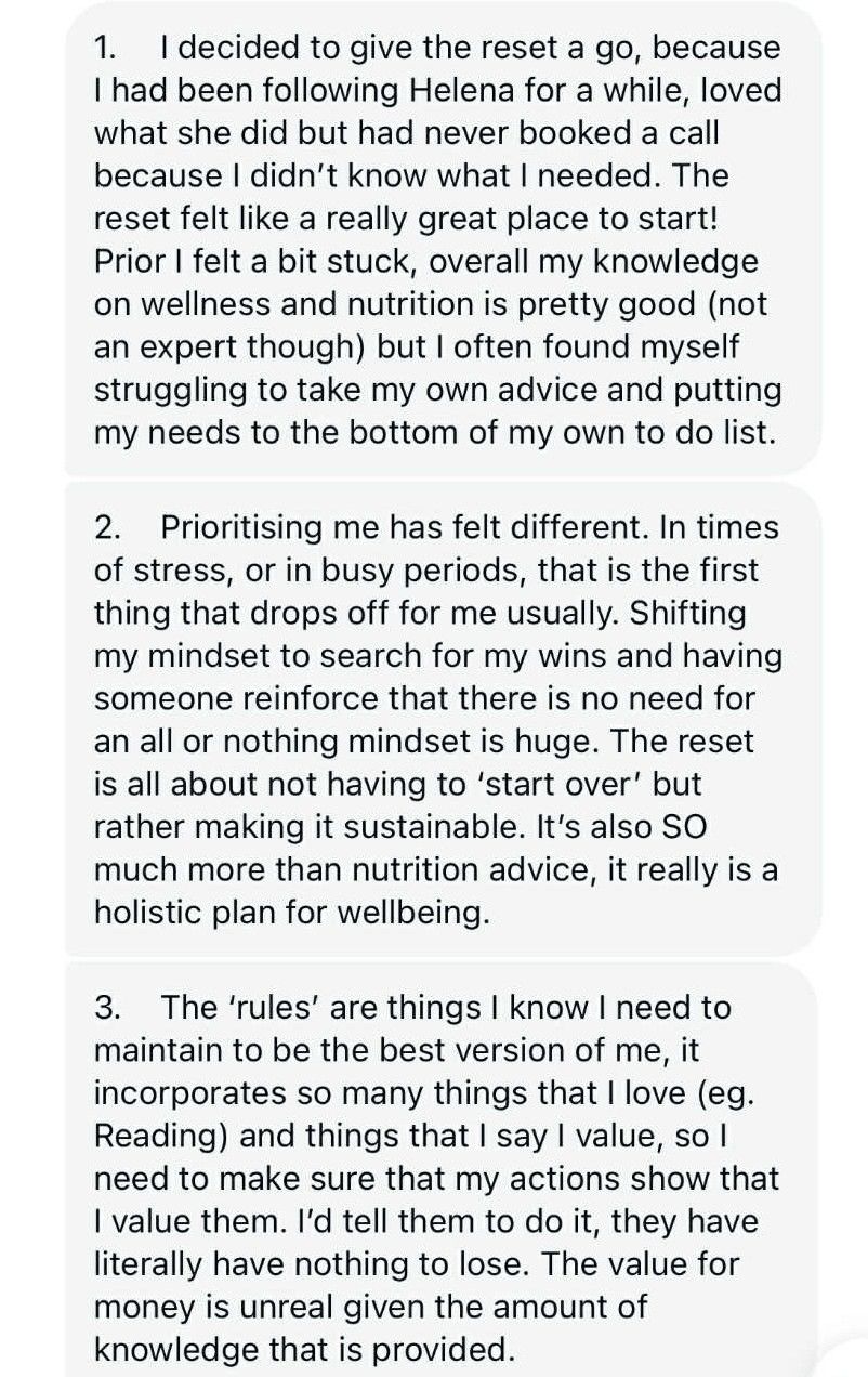 I have also been empowered with so much knowledge for years ahead to eat towards my goals and manage my food, emotions, weight and health! I’m so much more confident in myself. Wearing the clothes i want and generally just feeling like myself. Am also so much fitter! I also don’t constantly think about food - it takes up a normal amount of head space each day.Â